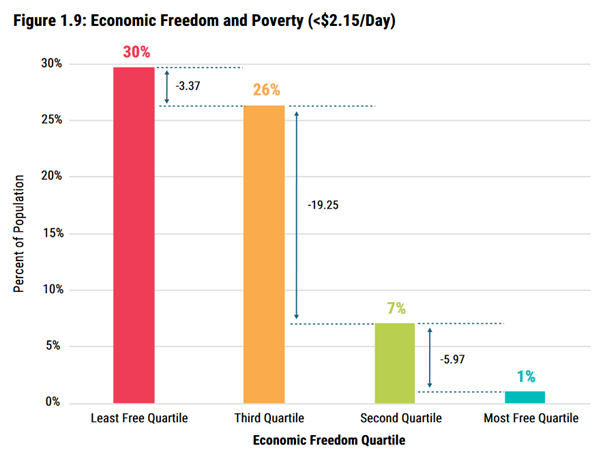 - Nel quartile meno libero, il 30% della popolazione è in condizioni di estrema povertà (2,15 dollari al giorno), contro appena l’1% del quartile dei Paesi più liberi.