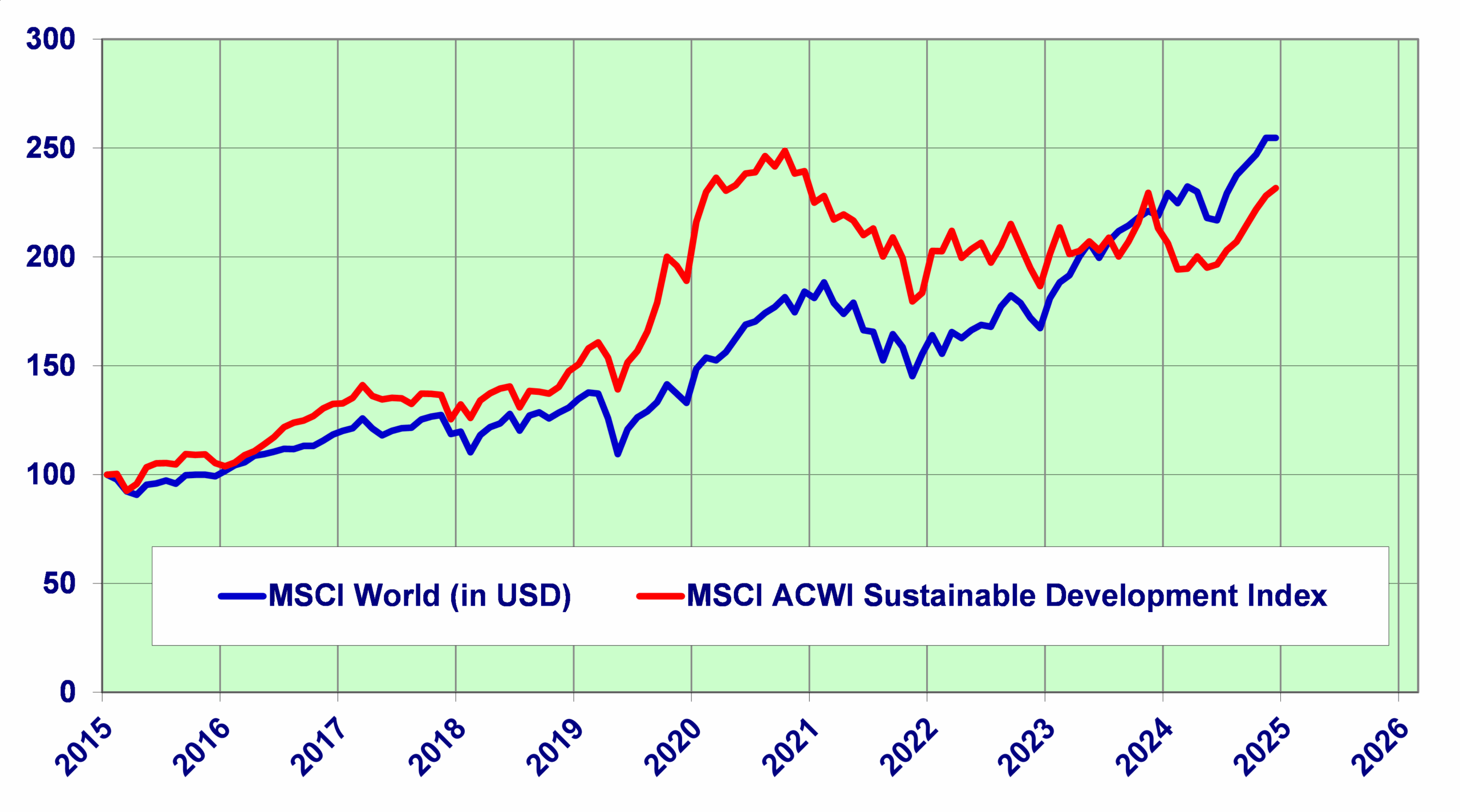 Konkreter wurde Dr. Dominik Zehnder, von der gleichnamigen Vermögensverwaltungsgesellschaft: «Es ist nicht Aufgabe der Anleger und Vermögensverwalter, politischen Einfluss zu nehmen». Die ESG-Argumente der UNO wurden von der EU perfektioniert, bis die Realität zurückkehrte. Die Energieverknappung machte plötzlich Atomkraftwerke wieder salonfähig und im Zuge der staatlichen Aufrüstung sind auch Rüstungsaktien wieder nachhaltigkeitskonform. Ausser viel neue Regulierungen hat die ESG-Bewegung für die Anleger nichts gebracht. Die «grünen Anleihen» weisen regelmässig tiefere Renditen als vergleichbare normale Anleihen auf, was den institutionellen Anlegern eine Unterperformance beschert. Seit dem ESG-Hype anfangs 2020 bewegen sich die rund 2’500 ESG-Aktien im MSCI ACWI Sustainable Development Index nur noch seitwärts und hinken seit Mitte Juni 2024 dem MSCI-Weltindex hinterher. Die ESG-Risiken wurden von vielen Anlegern unterschätzt und die Fehlallokationen von Kapital führten in Europa mangels Innovationen zu einem Verlust der Wettbewerbsfähigkeit.